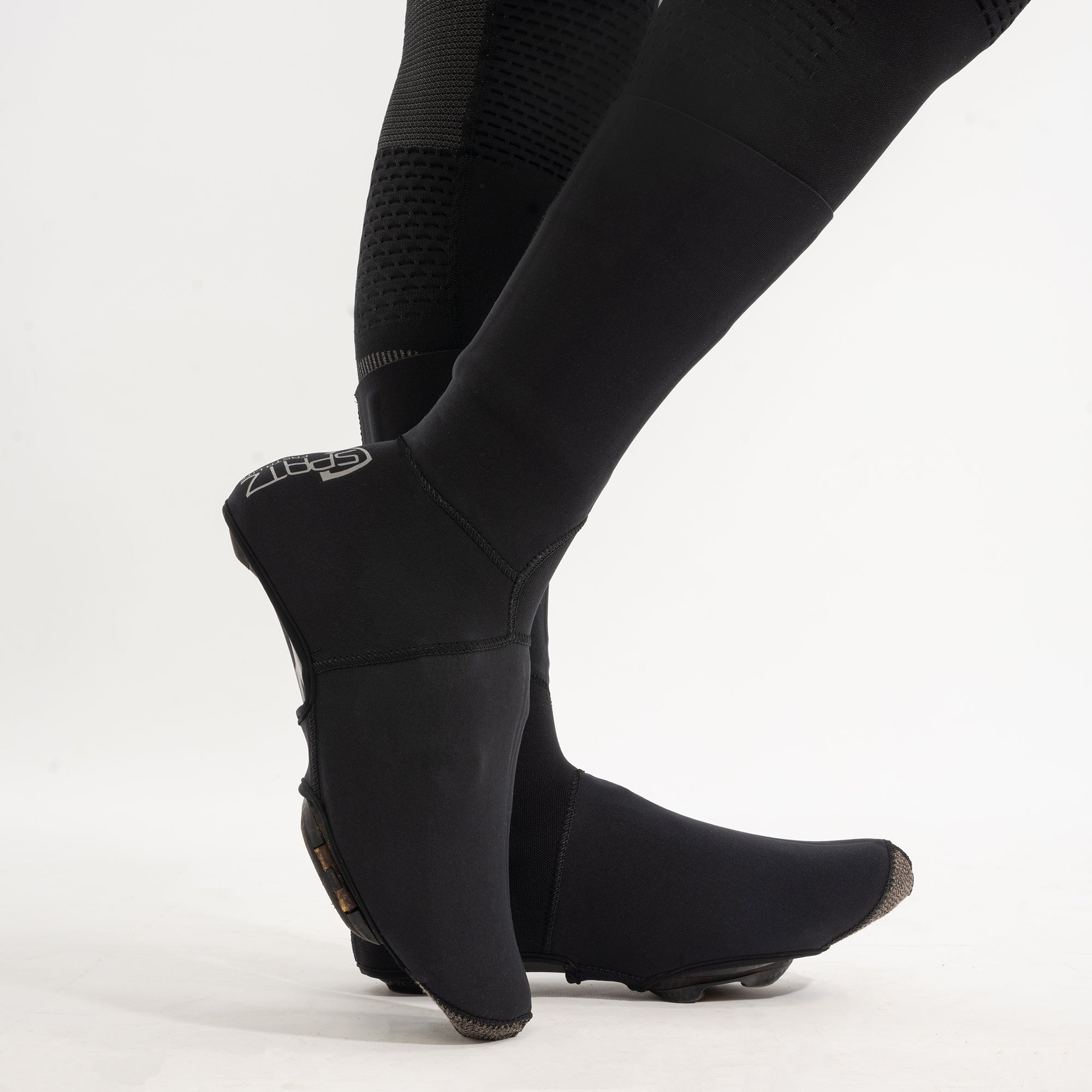 The leg area is designed to form a seamless transition between your leg and the overshoe. 15cm silicone seals run vertically down the leg to form a supple union with your skin or leg warmers/tights. The junction of tights / leg warmers and overshoes is so sleek that it is a challenge to see where the overshoes end and the leg warmers begin...